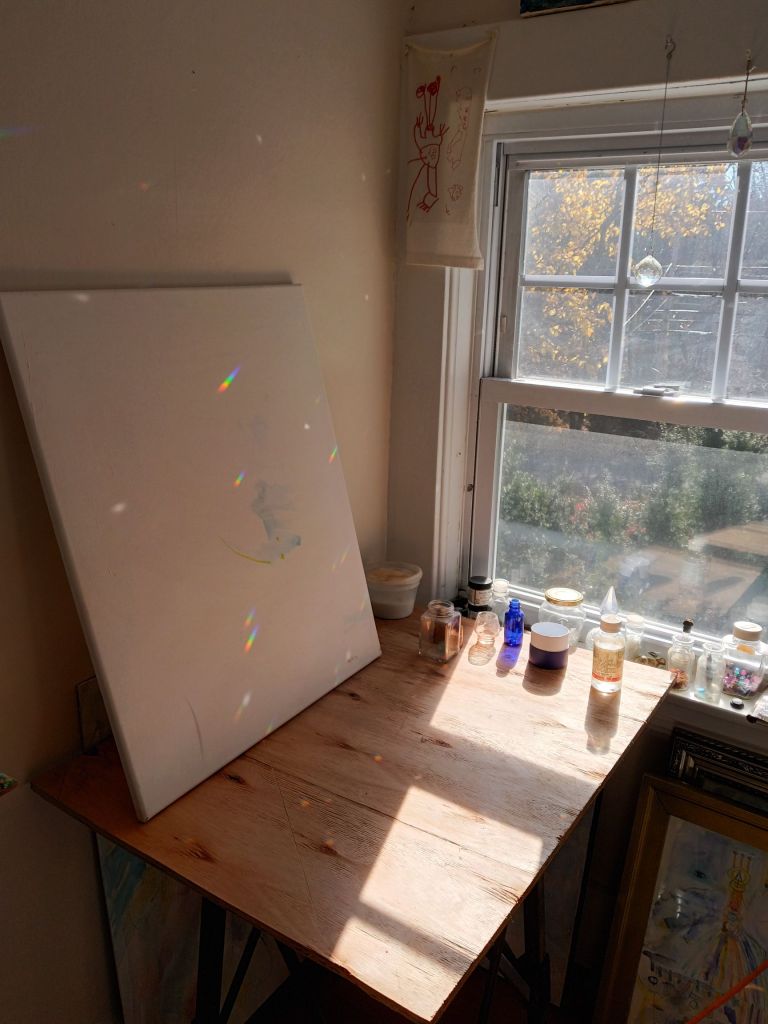 Rearranging my old yoga, now, sewing, painting, storage and files room since my son is living with me now. He has taken up residence in an old studio I worked out of for 17 years. Remnants of shelves of journals, paintings, trinkets, bits of sentimentality from raising my two sons here have been funneling to this next door room. I’ve resorted gladly to doing Feldenkrais rather than yoga which I continued to hurt myself doing so my hanging yoga sling “move over”.